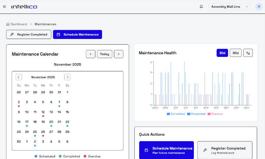 Gestiona el mantenimiento según el estado real del equipo, con modelos de predicción de fallos y un calendario central.